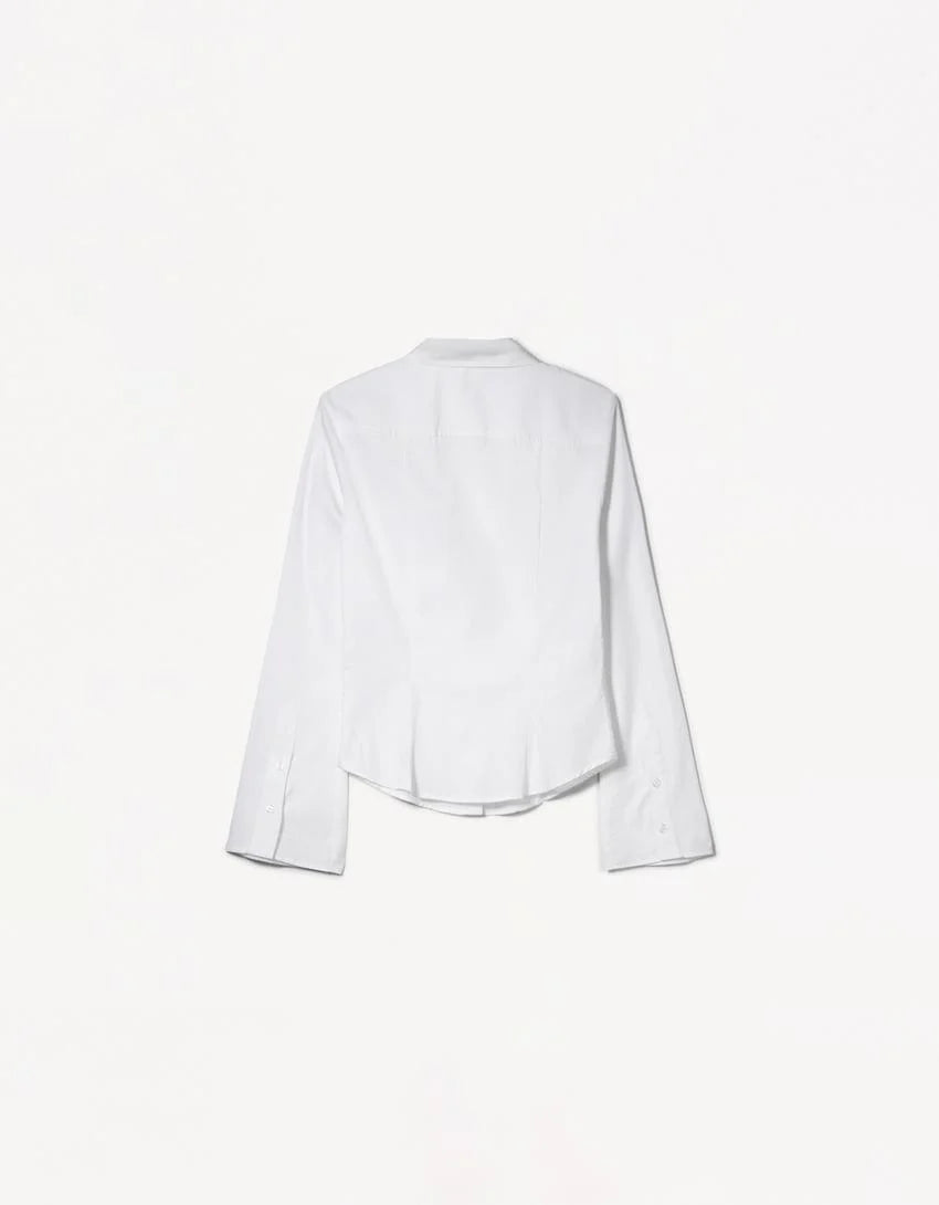 This is a striped blouse featuring a crisp blue and white pattern, a classic collar, and button-down closure. Its slim fit design and curved hem create a flattering silhouette, making it ideal for both professional and casual settings. The long sleeves add versatility and elegance to the overall look.