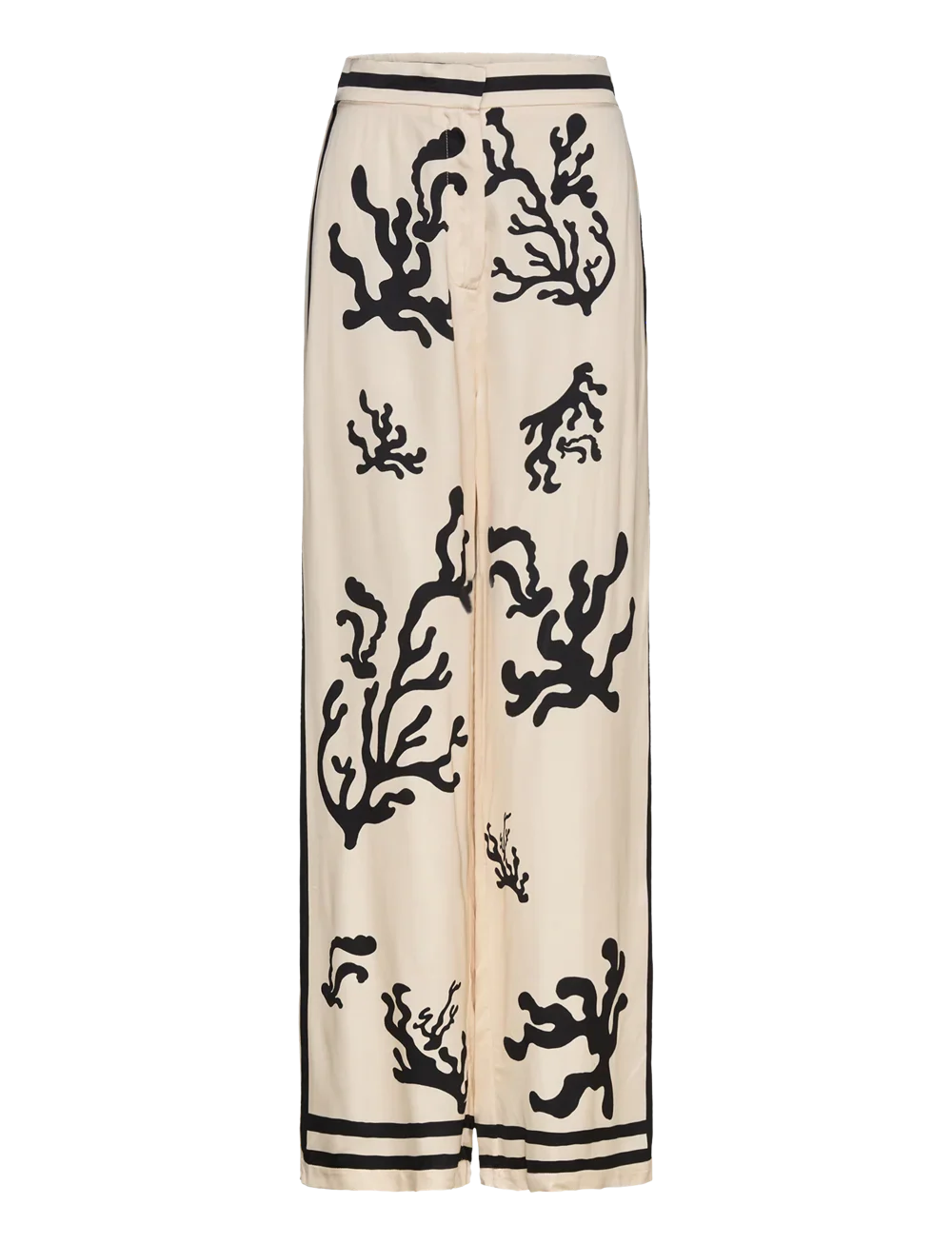 This is a statement co-ord set featuring a long-sleeved button-up shirt and wide-leg trousers with an artistic black coral print on a cream base. The outfit offers a bold and sophisticated look, perfect for making a fashion-forward impression. The loose and flowy fitensures comfort and elegance, ideal for both casual wear and special occasions. This versatile set is a true standout piece in any wardrobe.