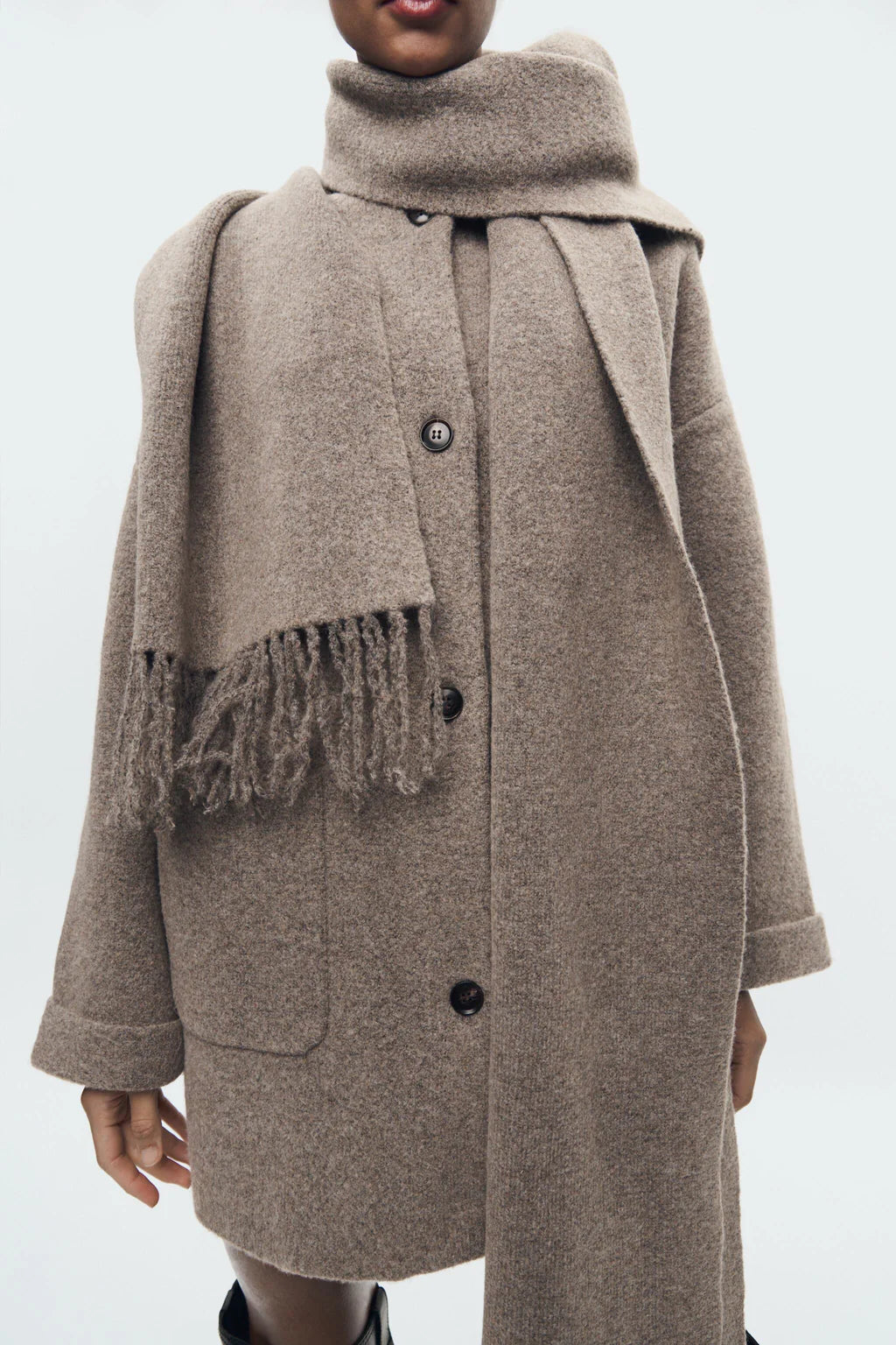 Cozy Oversized Coat with Scarf: This oversized coatcombines style and comfort with its soft wool blendand attached scarf detail for added warmth. Featuring a relaxed fit, front button closure, and large patch pockets, it’s both practical and chic. Perfect for cooler weather, this coat adds a touch of elegance to any outfit while keeping you cozy.